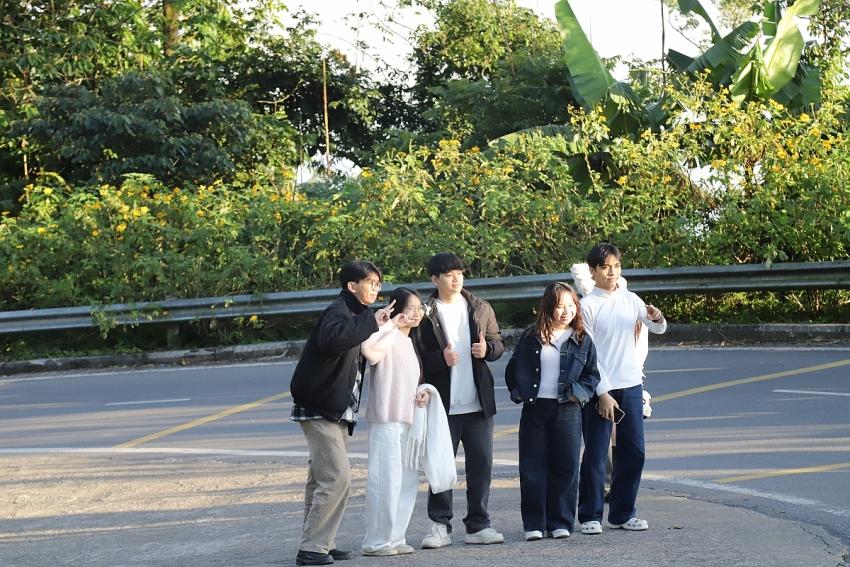 Các bạn trẻ hào hứng chụp ảnh tại đường lên Vườn Quốc gia Ba Vì. Ảnh: Bích Ngọc