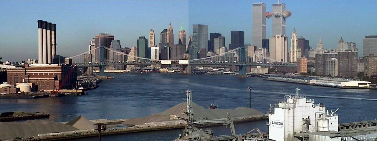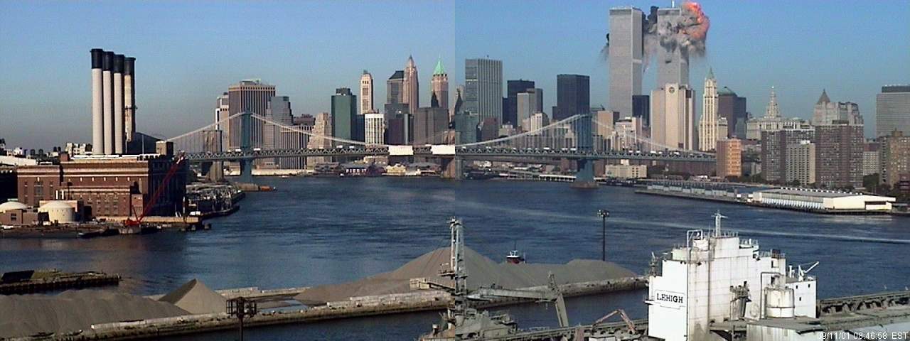 Chuyến bay số 11 của American Airlines (có thể nhìn thấy ở góc trên bên phải của bức ảnh) đến gần tháp phía bắc của Trung tâm Thương mại Thế giới. Bức ảnh được chụp từ cửa sổ ở khu Brooklyn, nơi có buổi triển lãm nghệ thuật Internet đang diễn ra. Mã thời gian có thể được nhìn thấy ở góc dưới bên phải của khung ảnh đã hứng minh điều đó
